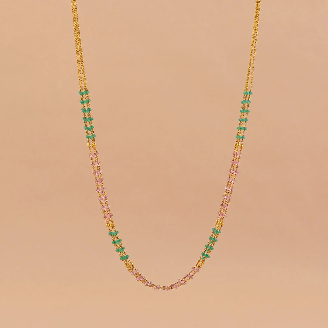 This is a delicate dual-strand beads mala featuring a combination of gold-toned chain links with beaded accents. The mala is designed with alternating sections of small pink and green beads, adding a subtle yet colorful contrast. The arrangement of beads gives it a balanced and elegant look, making it suitable for both traditional and contemporary outfits.